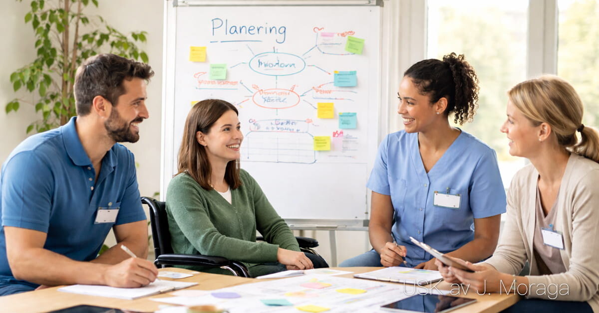 Dokumentation är en central del av arbetet med personer med funktionsnedsättning eftersom den gör stödet spårbart, rättssäkert och möjligt att följa upp. Den fungerar som en gemensam grund för planering, genomförande och utvärdering av insatser, särskilt när flera personer i personalgruppen arbetar med samma brukare och när flera huvudmän kan vara involverade. Dokumentation kan ses som en skriftlig redovisning av beslut, planering, genomförande och uppföljning av insatser, exempelvis i journaler och planer. Varför dokumentation är viktig Dokumentationen fyller flera funktioner samtidigt. Den bidrar till kontinuitet. När stödinsatser utförs av olika personer över tid behöver det gå att se vad som är gjort, hur det fungerade och vad som ska göras nästa gång. Dokumentation gör också att brukaren inte blir beroende av enskilda medarbetares minne eller arbetssätt. Den stärker rättssäkerhet och kvalitet. Beslutade insatser ska genomföras som planerat och med respekt för självbestämmande och integritet. Genom dokumentation blir det tydligare om insatserna motsvarar det som planerats i exempelvis en genomförandeplan eller individuell plan. Den underlättar samordning. När flera aktörer är involverade kan samordning behövas, exempelvis genom en samordnad individuell plan (SIP), där ansvar och samverkan tydliggörs. Vad som ska ingå i noggrann dokumentation av en aktivitet En noggrann dokumentation behöver vara saklig, tydlig och kopplad till mål och planering. I praktiken handlar det om att fånga det som är relevant för att kunna förstå både genomförandet och resultatet. Det som normalt behöver framgå är: • vilken aktivitet som genomfördes och varför (koppling till mål/plan) • hur aktiviteten genomfördes (upplägg, stöd, hjälpmedel, anpassningar) • brukarens delaktighet och inflytande (vad personen valde, uttryckte, föredrog) • observationer av det som påverkade aktiviteten (t.ex. stress, trötthet, motivation, miljöfaktorer) • utfall och bedömning (vad fungerade, vad blev svårt, vad gav effekt) • behov av förändring inför nästa gång (justering av stöd, struktur, hjälpmedel) Det är också viktigt att dokumentationen ligger i linje med verksamhetens krav på sekretess och tystnadsplikt samt att uppgifter hanteras ansvarsfullt. Hur dokumentation kan förbättra insatser och stöd Dokumentation blir särskilt värdefull när den används aktivt för utveckling, inte bara som en “avprickning”. Genom återkommande noteringar går det att se mönster över tid: vilka situationer som skapar oro eller utmattning, vilka anpassningar som minskar stress, och vilka arbetssätt som stärker självständighet och delaktighet. Den gör det möjligt att utvärdera måluppfyllelse: om målet är ökad självständighet i en vardagsaktivitet kan dokumentationen visa om personen tar fler steg själv, behöver mindre stöd eller om målet behöver justeras för att vara realistiskt. Den stödjer också kvalitetssäkring i arbetslaget. När genomförande och resultat synliggörs blir det lättare att arbeta mer enhetligt, att dela fungerande strategier mellan kollegor och att upptäcka när stödinsatser inte längre matchar behovet och därför måste anpassas. Detta är nära kopplat till planering, genomförandeplan och uppföljning.